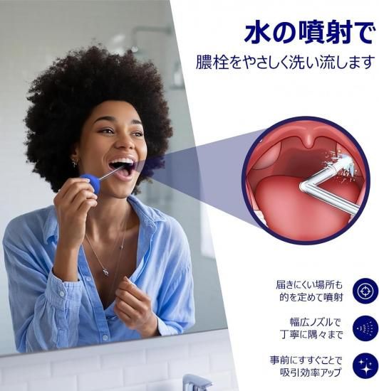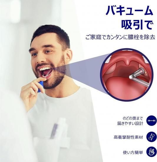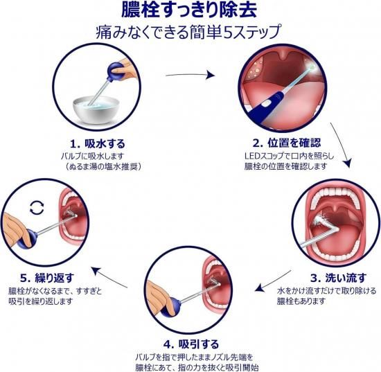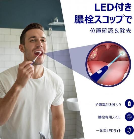 ご家庭でで手軽に膿栓を除去 バキューム吸引器:膿栓を洗い流す/吸引する LED スコップ:膿栓の位置・状態・サイズ等を確認する/すくい取る