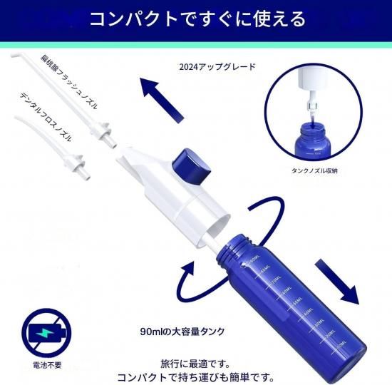 携帯にも便利:コンパクト・デザインで、付属ノズルもタンク内にすっきり収納可。外出先での口腔ケアにもおすすめ
