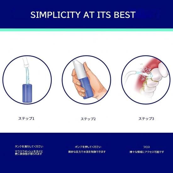 水を本体に注入し、狙いを定め洗浄するだけ。シンプルな操作で、お子様のご利用にも。敏感な歯や歯茎、膿栓に適した水圧に設計されています